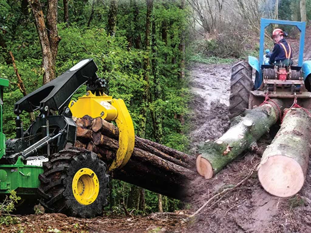 - A farm tractor with a winch attached can skid tree lengths from wood to roadside.